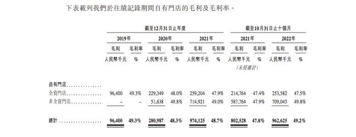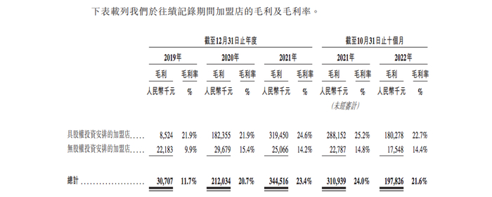 而此时一心想要上市融资的KK集团,却已经无法回头。为了上市,KK集团还不断将加盟店转为自营门店。2022年前10个月,KK集团加盟店毛利率仅为21.6%,而自营门店毛利率则高达49.2%。两相比较之下,KK集团的所作所为也就有了合理解释。
