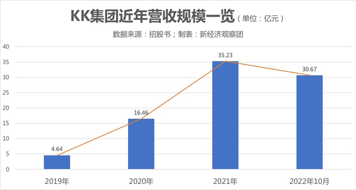 商业版图的不断扩张, KK集团营收水涨船高。根据招股书,2019-2022年10月,KK集团分别实现营收4.64亿元、16.46亿元、35.23亿元、30.67亿元。官方表示,集团收益主要来源于货品销售以及基于销售的管理及咨询服务收入。