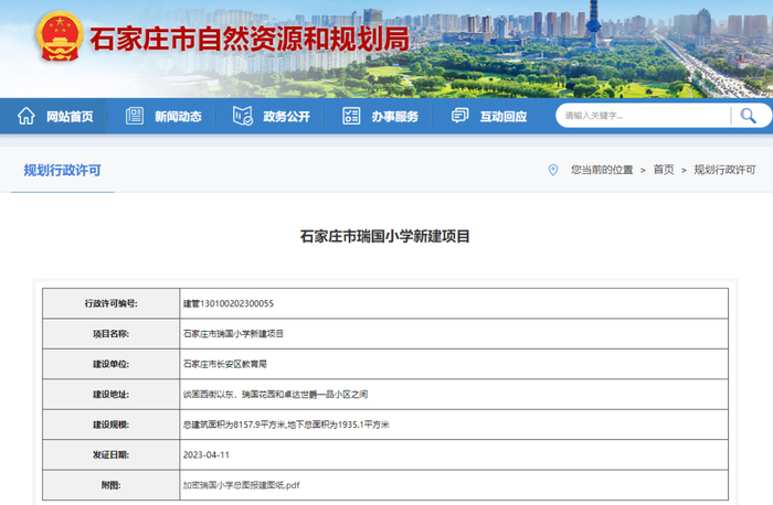 石家庄市自然资源和规划局发放的《石家庄市瑞国小学新建项目建设工程规划许可证(建筑类)》显示,该项目的建设单位为石家庄市长安区教育局,建设地址位于谈固西街以东、瑞国花园和卓达世爵一品小区之间。