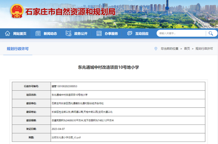 石家庄市自然资源和规划局发放的《东兆通城中村改造项目10号地小学建设工程规划许可证(建筑类)》显示,该项目的建设单位为石家庄市长安区西兆通镇东兆通村股份经济合作社,建设地址位于长安区杜庄街以东、绵河道以南、天桂中街以西、洨河大道以北。