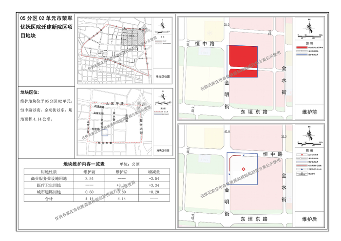 位于恒中路以南、金明街以东,用地面积4.14公顷。地块维护后,商业服务业设施用地减少3.54公顷,医疗卫生用地增加3.34公顷,城市道路用地增加0.20公顷。