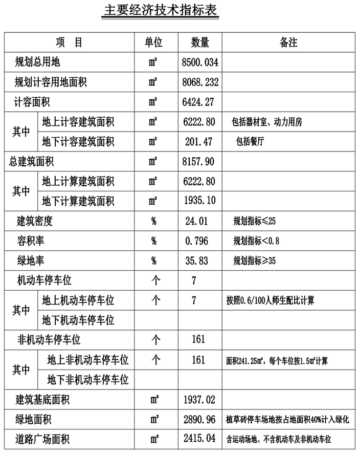 该项目的建筑占地面积为3368.22平方米,建筑密度为15.59%,绿地面积为7657.83平方米,绿地率为35.46%。项目规划机动车停车位48个(15个/100教工、2.4个/100师生),非机动车停车位270个(20个/100师生)。