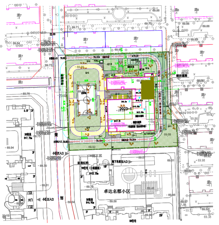 该项目总用地面积为21598.72平方米,总建筑面积为24688.93平方米,其中地上17206.81平方米,地下7482.12平方米(地下车库5818.13平方米,风雨操场1663.99平方米),计容建筑面积为16957.57平方米,容积率为0.79。