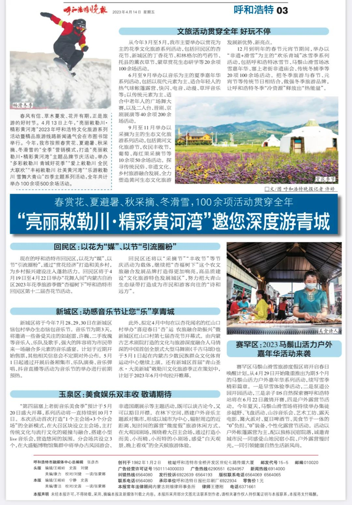 春风有信、草木蔓发、花开有期,正是旅游的好时节。4月13日上午,“亮丽敕勒川·精彩黄河湾”2023年呼和浩特文化旅游系列活动暨精品旅游线路新闻通气会在呼和浩特市图书馆举行。今年,呼和浩特市按照春赏花、夏避暑、秋采摘、冬滑雪的“全季”营销模式,打造“亮丽敕勒川·精彩黄河湾”主题品牌节庆活动,举办“多彩敕勒川 青城好花季”“爱上敕勒川 全民大联欢”“丰裕敕勒川 壮美黄河湾”“乐游敕勒川 雪舞大青山”四季主题系列活动,全年共计举办100余项500余场活动。