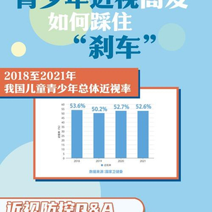 如今,青少年近视问题已经成为社会各界关心的热点与痛点。2018年印发的《综合防控儿童青少年近视实施方案》提出的目标是,到2023年,力争实现全国儿童青少年总体近视率在2018年的基础上每年降低0.5个百分点以上。而国家卫健委的公开数据显示,2018至2021年,我国儿童青少年总体近视率分别为53.6%,50.2%、52.7%、52.6%。