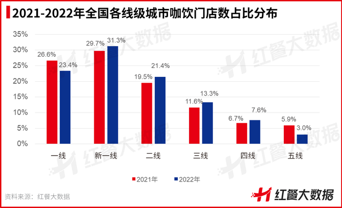 红餐大数据显示,相较2021年,2022年新一线城市及二三四线级城市的门店数占比均有所提升。可见,下沉市场的咖饮门店增速较快,市场发展潜力大。