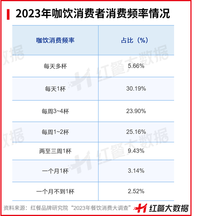 在这个过程中,咖啡越来越普及,逐渐从一种小资的生活方式变成消费者的生活日常。红餐品牌研究院“2023年餐饮消费大调查”显示,在受访咖饮消费者中,每周至少饮用一杯咖饮的受访者达到了84.91%,其中每天至少饮用一杯咖饮的消费者超过了35%。