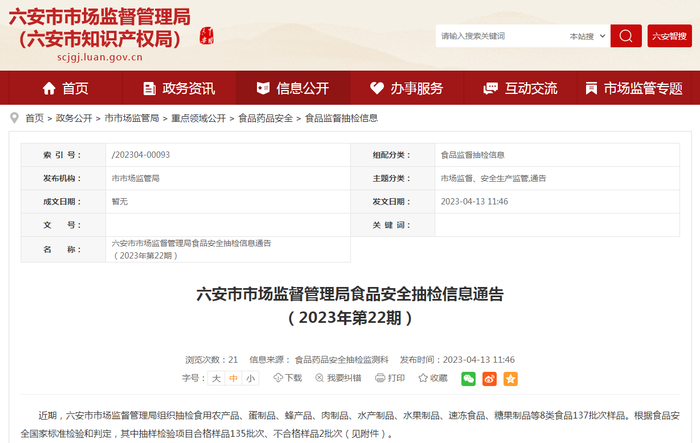 安徽省六安市市场监管局抽检食品137批次 不合格2批次