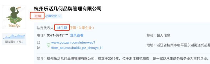 据天眼查显示,杭州乐活几何品牌管理有限公司成立于2019年8月,注册资本500万人民币,经营范围含企业品牌管理;品牌营销策划、企业形象策划;食品经营等,由林生斌与林云婷分别持股95%、5%。