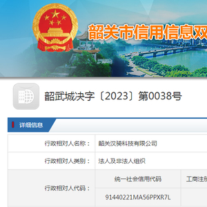 | 行政相对人名称: | 韶关汉骑科技有限公司 |