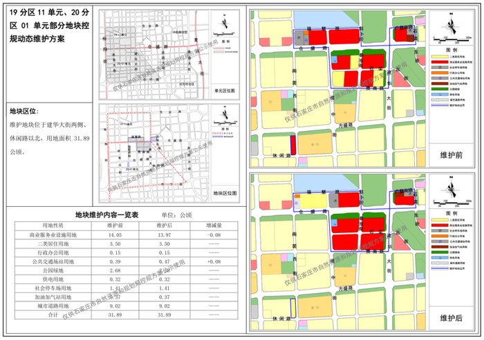 维护地块位于建华大街两侧、休闲路以北,用地面积31.89公顷。维护后,居住用地不变,商服设施用地减少0.08公顷,公共交通场站用地增加0.08公顷,其余规划内容不变。