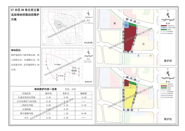 地块位于新华路以南、西王南街以东、孔德路以北、客运东街以西,总用地面积5.38公顷。规划调整后,长途客货运站用地减少3.46公顷,二类居住用地增加3.38公顷。