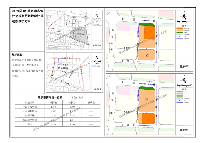 位于东垣东路以南、金明街以西、荷园路以北、十里铺街以东,总用地面积9.49公顷。地块维护后,行政办公用地位置进行了调整。