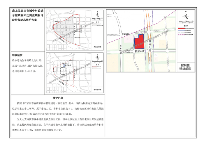 按照《石家庄市容积率指标管理规定(修订版)》要求,维护地块用途为商业用地,位于石家庄市二环外,属于密度二区,容积率上线是5.0,按照长安区政府来函文件提出容积率达到4.25,满足店上西庄屯两村商业回迁需求。