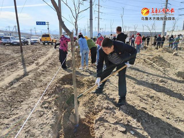 在植树区,米东区72家企事业单位的工作人员和热心群众组成的植绿队伍挥锹铲土、围堰浇水栽种树木,在他们身后,一排排新栽种的苗木整齐树立在化工工业园区道路两侧的绿化带内。
