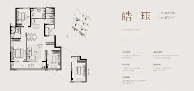 其中建面约122㎡四室两厅两卫:三开间朝南,厨房带岛台,主卧卫生间也是明卫。