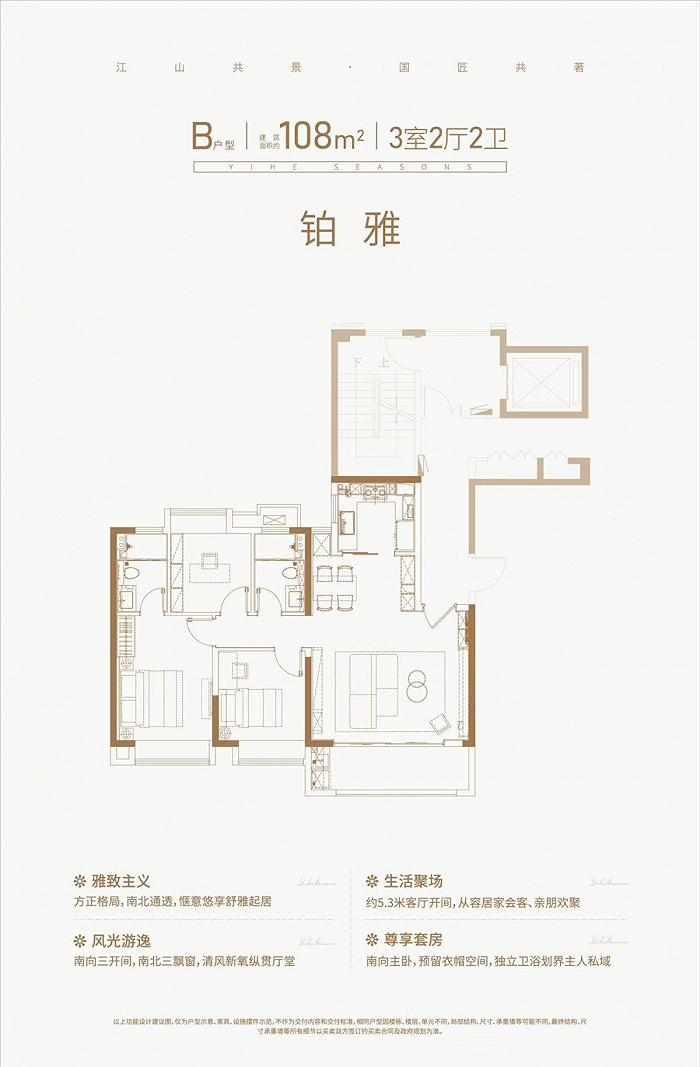 约108㎡B户型:3室2厅2卫,爆款横厅户型更好采光和居住尺度。方正格局,南北通透,约5.3米客厅开间,南北三开间带飘窗,南向主卧预留衣帽空间,主人独立卫浴私域享受。
