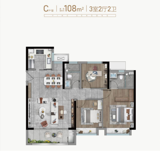 约108㎡C户型:3室2厅2卫,全明通透空间,厨、餐、客阳台通联带来宽阔视觉,南向主卧独立卫浴、预留衣帽空间,打造主人尊享私域。
