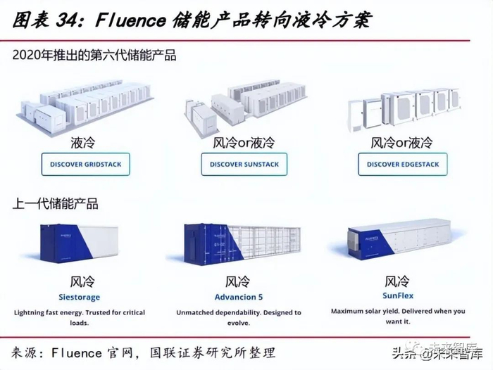 当前国内储能液冷渗透率较低,海外市场对液冷接受度较高。据 GGII,2021 年 国内储能领域液冷温控渗透率仅为 12%,预计 2025 年有望迅速提升至 45%。海外 市场缺乏统计数据,但从全球系统集成龙头 Fluence 的产品结构变化可以看出液冷 渗透率快速提升的趋势。Fluence 在 2020 年以前的集成产品均为风冷方案,2020 年 后推出的新一代产品中,光伏配储和工商业储能产品提供风冷和液冷两种选择,电网 级储能产品仅提供液冷配置。