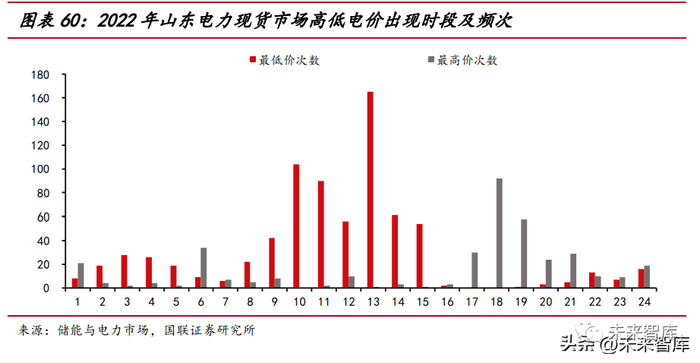 现货市场前景广阔,考验电价预测及运营管理能力。据储能与电力市场模拟测算, 2022 年山东 2 小时储能系统参与现货市场,全年理想情况下可获得价差水平为 0.57119 元/kWh。虽然低电价在中午时段,高电价在傍晚时段均有相当的集中度,但 整体仍较为分散,需要运营方具备更精细的电价预测及运营管理能力以获得较高的套 利空间。智慧运营和交易辅助或将成为集成商打造差异化的重要途径。当前已有 14 个省 市推进全国电力现货市场试点,预计 2023 年内现货市场在全国的推进会更加迅速。22 年 10 月,融和元储中标全国首个独立储能现货交易辅助决策项目,我们认为相关 的储能系统运营、数字化和智能化应用有望构成未来系统集成商打造差异化的新壁垒。