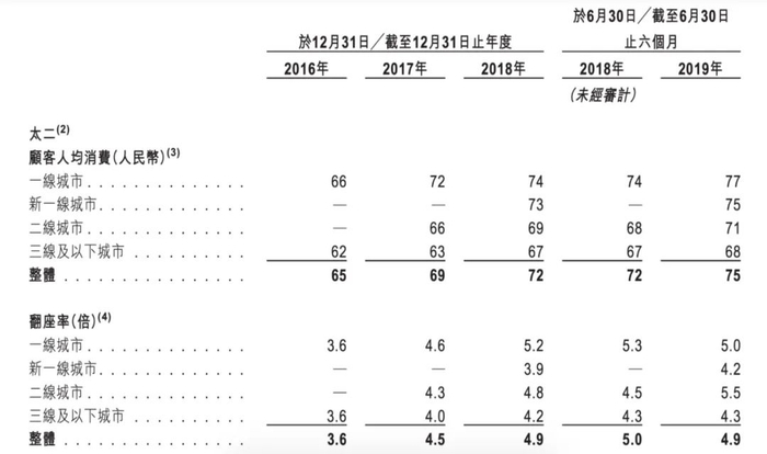 2016年到2019年上半年间,太二的顾客人均消费和翻座率情况