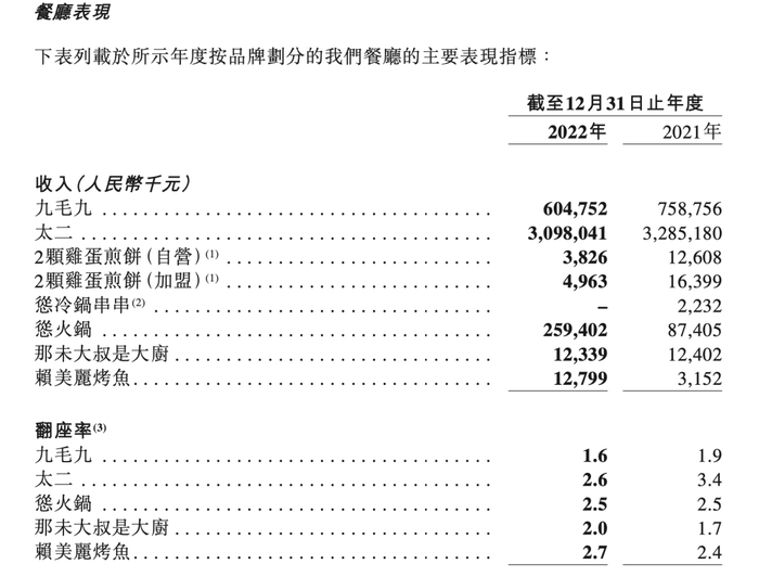 不过,即便都处在疫情期间,不同品牌的表现也有所不同。比如九毛九集团旗下的怂火锅同店销售(即开了一年以上门店的销售额)就保持了增长,而太二在九毛九集团中的同店销售额降幅是最大的,超过了九毛九品牌的11%,同比下降了22.3%,从2021年的25.3亿元下降至19.7亿元。