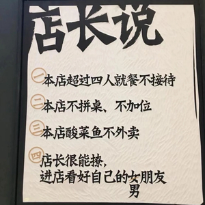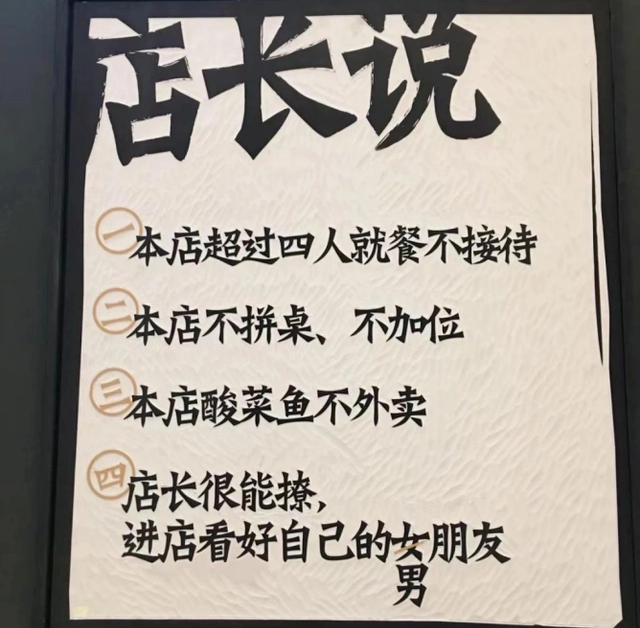 原本悬挂在门口白底黑字的“店长说”, 陆陆注意到,从“本店超过四人就餐不接待”“本店不拼桌、不加位”,不知何时悄悄变为了“酸菜鱼不加辣不减辣”“做自己,挺好”。