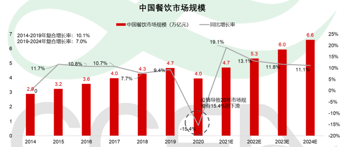 2019年,中国餐饮市场的规模为4.7万亿元,两年后的市场规模保持在同一水平。但其中,79%的份额都来自非连锁餐饮。这意味着,连锁品牌们,抢夺的是剩下20%的市场份额,这20%的空间里,有着汉堡、火锅、串串、酸菜鱼等数不清的细分赛道。