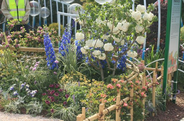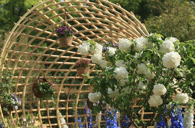 随后步入一段幽长小径,花带蜿蜒如河流,此景名为“撷梦环游”,小径两侧各有一株木绣球,白色的花球压满枝头、如玉似雪,分外引人注目。