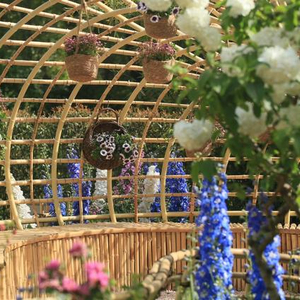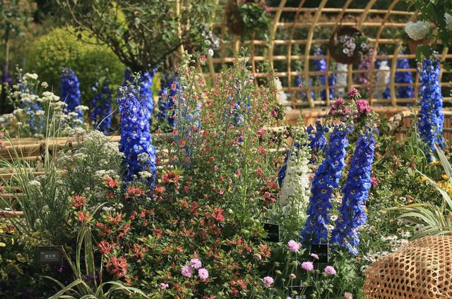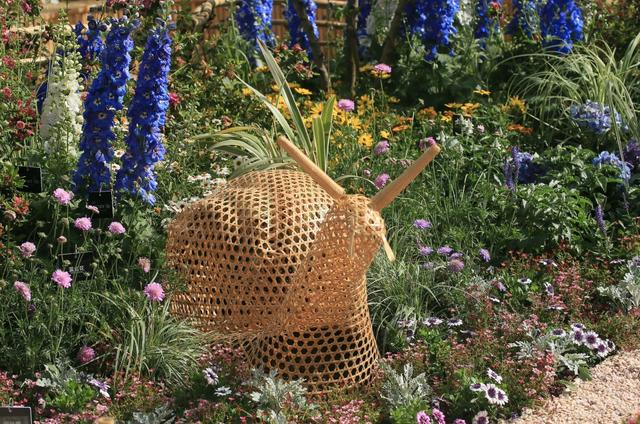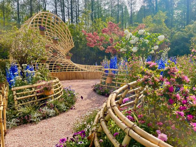 “梦海沉吟”为景观序列高潮,蜗牛状竹编构筑被一片粉紫色调的花海所环绕,以多种杜鹃花和优雅唯美的大花飞燕草,编织了一个绚烂悠长的梦;