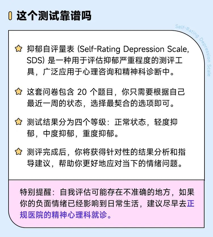 如果你怀疑自己有抑郁症,也可以来丁香医生 App 做一下这套抑郁症测试。如果你身边人有抑郁的一些表现,你也可以把这个测试分享给他们,帮他们理解自己。