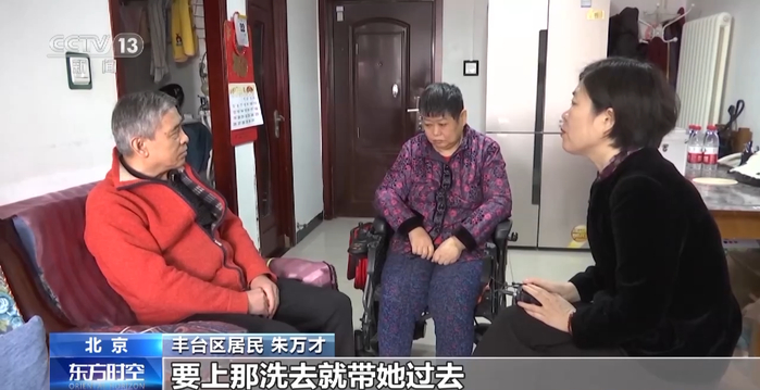 北京市丰台区居民 朱万才:我想出去一趟,他们也能过来陪一会儿。还能打电话给他们,需要什么服务,需要洗澡他们那也有澡堂子,要上那洗去就带她过去,他们也给洗洗。