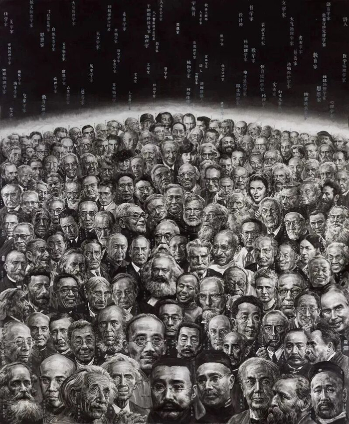 上观:看完画展,我发现您的创作始终着眼于人,表现人的精神。画面中既有先贤的精神风骨,也有普通人的真情流露。在描绘历史人物与现实中的普通人时,有哪些相同和不同之处?冯远:画历代先贤,我主要是从各种历史资料中寻找他们的形象,距离现在越久,能找到的资料就越少,有些只能参考《辞海》中的线描与白描。我会在尊重线描形象的基础上,将其“翻译”为立体的造型。而画现当代人物时往往有照片为参照,我会适当减弱一点明暗关系,塑造一种平衡和谐的形象。我画的普通人大都是我遇见过的真实的人,但表现真实并不等于把我给他们拍的照片直接搬到画面上来。我会回忆与他见面时的情景、他的五官和个性特征,然后放大处理他的人物形象,努力还原他鲜活的精神状态。换句话说,我不是对生活中的人物原型进行“直译”,而是通过我对人物的理解,将其翻译成艺术形象。上观:您的大型人物作品大都采用群像的形式。比如您的代表作《世纪智者》高逾5米,一个多世纪中外文化名人的头像被重叠组合在一起,如此特别的排列方式是如何构思的?冯远:我之所以画《世纪智者》是因为1999年全世界都在眺望新世纪,当时全球有局部战争、瘟疫、饥荒,舆论对新世纪的预测带有一些灰色论调。站在世纪之交回望我们国家走过的百年历程,政治家、思想家、教育家、科学家、艺术家对中国产生了深刻影响,让中国发生了翻天覆地的变化。我想把这100年来为我们创造精神财富、推动社会发展的杰出人物画下来,通过对人物的刻画来表达一个世纪的精神。这件作品问世时,很多观众都表示惊讶:这也算中国画?确实,我刻意打破了中国传统绘画的造型,把一个多世纪中外名人的头像重叠组合在一起,采用地平线的弧形,背景则使用黎明之前的鱼肚白,满天的星空中缀满他们的名字和身份。多年后,大家逐渐接受了这件作品,甚至认为这是我的代表作之一。我后来的一系列作品比如《公民》《中华人文图》,包括这次画展中亮相的最新作品《世界》也是采用这种跨越时空的方法,把不同的事件和人物以意识流手法交织在一起。