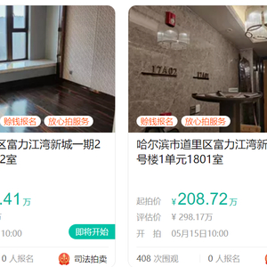 据阿里资产司法拍卖显示,哈尔滨市道里区富力江湾新城一期有两套房产被法拍,资料显示均“登记在曲婉婷名下”。一套起拍价为208.7221万元,另一套起拍价为242.4101万元。