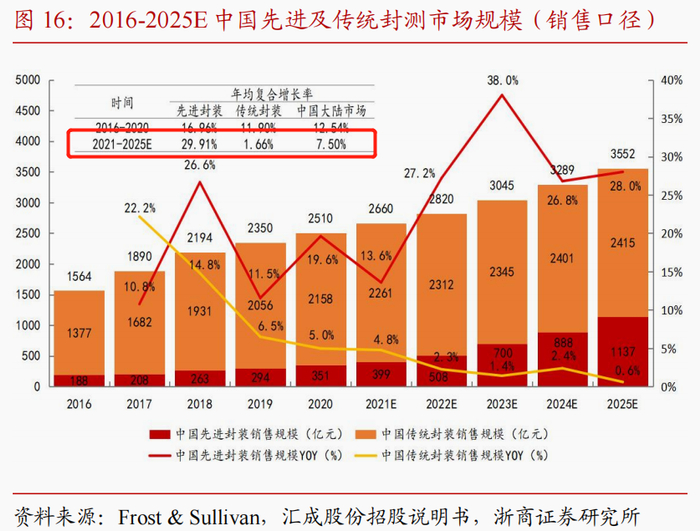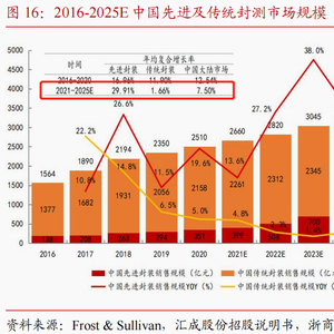 据Frost & Sullivan数据预测,中国大陆封测市场2021-2025E CAGR 约为7.5%,2025年市场规模将达到3552亿元,占全球封测市场约为75.6%。其中,中国大陆先进封装市场增长迅速,2021-2025E CAGR约为29.9%,预计2025年中国先进封装市场规模为1137亿元,占比中国大陆封装市场约为32.0%。
