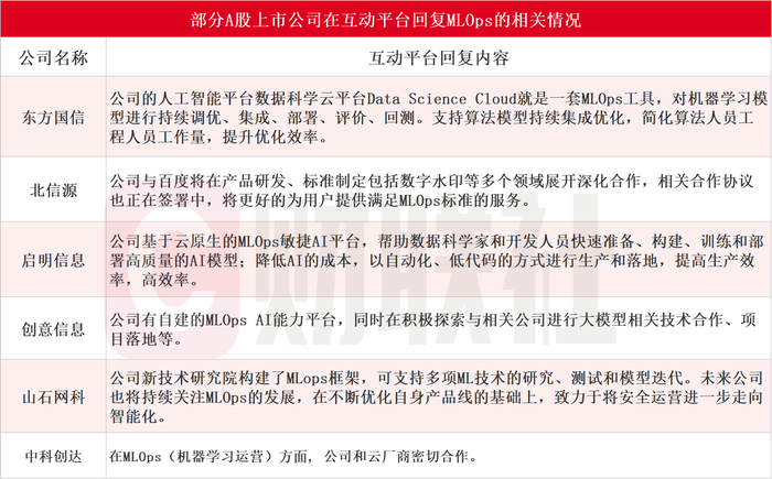据财联社不完全统计,目前已有多家上市公司在互动平台回复在MLOps的相关情况,具体如下: