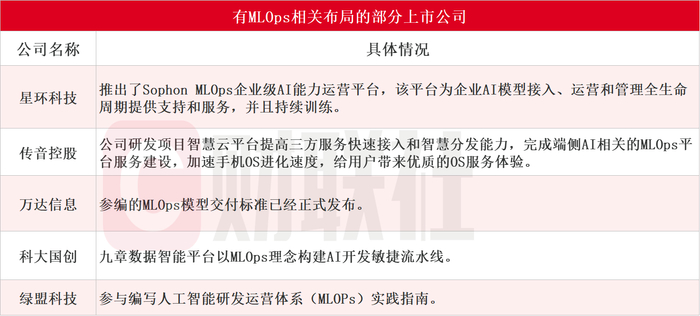 据财联社不完全统计,除了上述在互动平台回复的公司外,还有星环科技、传音控股、万达信息、科大国创、绿盟科技等公司有MLOps相关布局,具体情况如下: