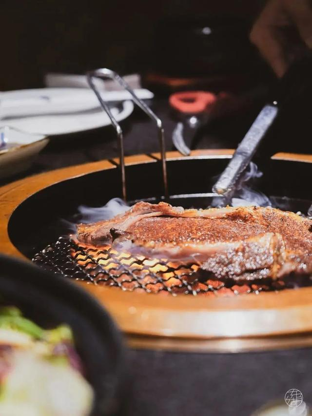 雪花纹理的M9+等级和牛,现切现称,在炭火的加持下展现出极致的美味。