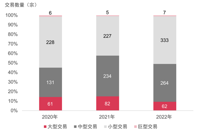 注:交易量级划分依据交易金额:巨型交易(100亿元及以上)、大型交易(10亿元至100亿元)、中型交易(1亿元至10亿元)、小型交易(1亿元以下)