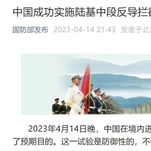 中国国防部14日又通报一个大新闻:2023年4月14日晚,中国在境内进行了一次陆基中段反导拦截技术试验,试验达到了预期目的。这一试验是防御性的,不针对任何国家。