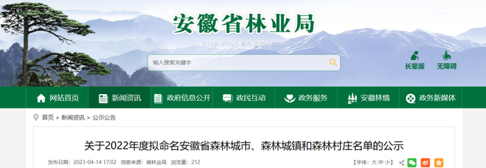 按规定,对以上拟命名“安徽省森林城市”、“安徽省森林城镇”、“安徽省森林村庄”进行公示,公示期为5个工作日(2023年4月17日—2022年4月21日)。