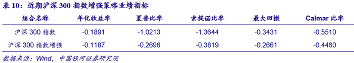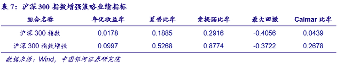 指数增强策略结果如图9和表7所示。沪深300指数增强策略年化收益率为9.97%,夏普比率为0.527,索提诺比率为0.877,Calmar比率为0.268,表现显著好于沪深300指数,最大回撤为37.22%,小于沪深300指数40.56%的回撤。近两年指数增强策略的年化收益率为2.60%,远超沪深300指数的-13.80%,夏普比率为0.230,索提诺比率为0.354,最大回撤为17.95%,Calmar比率为0.145,表现较为理想。