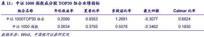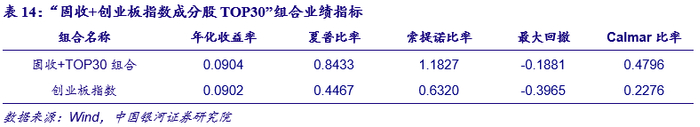 创业板指数成分股TOP30组合的年化收益率为9.04%,夏普比率为0.843,索提诺比率为1.183,Calmar比率为0.480,表现好于创业板指数,最大回撤为18.81%,远小于创业板指数22.76%的回撤。