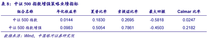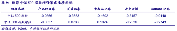 中证500指数增强策略年化收益率为9.83%,夏普比率为0.505,索提诺比率为0.786,Calmar比率为0.218,表现显著好于中证500指数,最大回撤为45.03%,小于中证500指数58.08%的回撤。