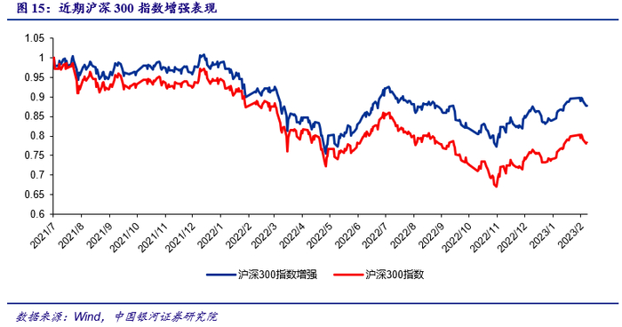 下面我们设置交易成本为双边千分之一点五,回测窗口为2021年6月至2022年12月。窗口期内中证500指数增强策略年化收益率为-8.66%,夏普比率为0.078,索提诺比率为0.102,Calmar比率为-0.015,表现显著好于中证500指数,最大回撤为23.36%,小于中证500指数31.57%的回撤。沪深300指数增强策略年化收益率为-11.87%,夏普比率为-0.270,索提诺比率为-0.382,Calmar比率为-0.446,最大回撤为26.61%,小于沪深300指数34.31%的回撤。由此可见,该因子对中证500和沪深300指数均有增强作用。