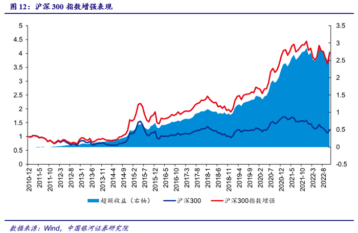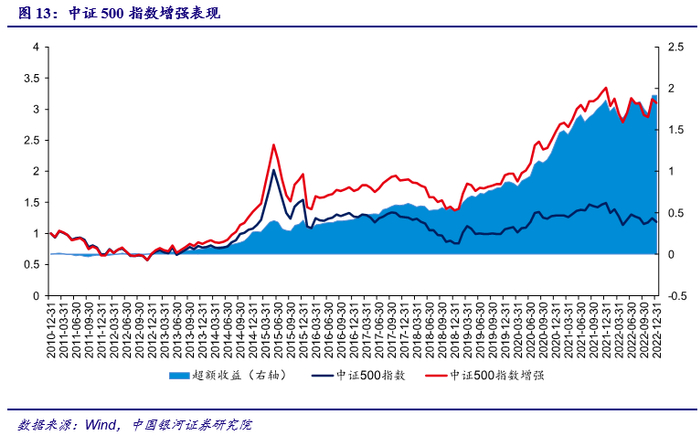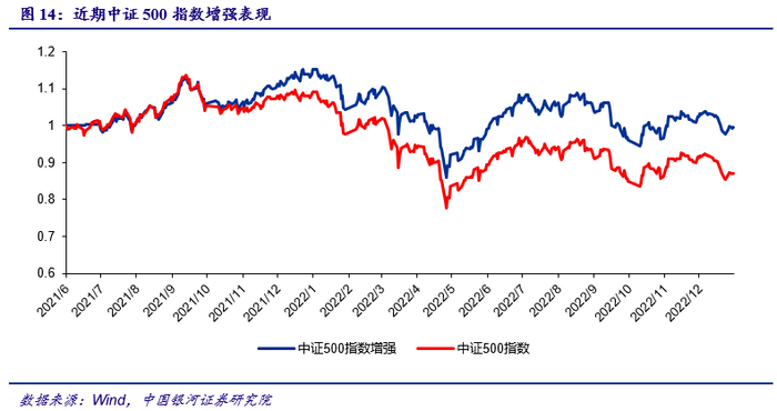 为了更好地控制跟踪误差,本文使用线性约束优化求解的方式分别对中证500指数和沪深300指数进行增强测试,回测窗口为2011年1月至2022年12月,选股池为沪深A股所有股票,月末调仓,不计交易成本。我们得到的因子是负向因子,因此组合预期收益率最大化等价于因子暴露最小化。在构建业绩增强组合时,本文设定业绩增强组合相对指数行业权重的偏离度不超过1%,Barra 风格因子暴露偏离度不超过 1%,个股权重偏离度不超过1%,指数成分股权重之和大于等于80%: