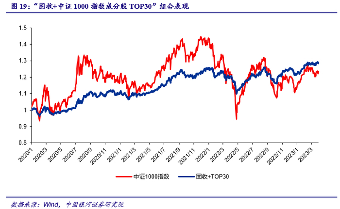 我们选取中债1-3年信用债指数作为无风险资产,TOP30组合的交易成本为双边千分之一点五,m初值为1,a为0.2,F为0.7,回测时间为2020年1月2023年3月,“固收+TOP30”组合的年化收益率为8.51%,夏普比率为1.023,索提诺比率为1.389,Calmar比率为0.676,表现好于中证1000指数,最大回撤为12.58%,小于中证1000指数34.62%的回撤。