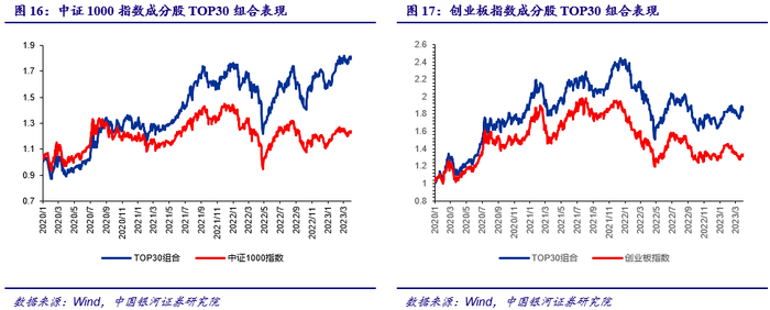 因子的表现在集中持仓的组合中同样可以产生有效的作用。我们分别选取中证1000指数和创业板指数成分股中每月该因子值排名最靠前的30只股票等权配置,交易成本为双边千分之一点五,回测时间为2020年1月2023年3月,TOP30组合的年化收益率为20.99%,夏普比率为0.935,索提诺比率为1.268,Calmar比率为0.682,表现显著好于中证1000指数,最大回撤为30.77%,小于中证1000指数34.62%的回撤。2020年年化收益率为31.68%,2021年年化收益率为36.18%,2022年年化收益率为-10.65%。