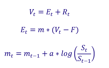 其中,V_t表示t时期投资组合的资产总值,E_t表示t时刻风险资产(TOP30组合)的价值,R_t为t时刻投资无风险资产(货币型基金)的价值,m为风险乘数,F为组合的保本额度。在这里,我们引入一个正向动态风险乘数调整因子a,对 CPPI策略的风险乘数m动态调整,当股价上涨时,风险乘数 m 随收益率上涨而上涨,能捕捉牛市盈利;股价下跌时,风险乘数 m 随收益率下跌而下跌,由此起到向下保护的目的。