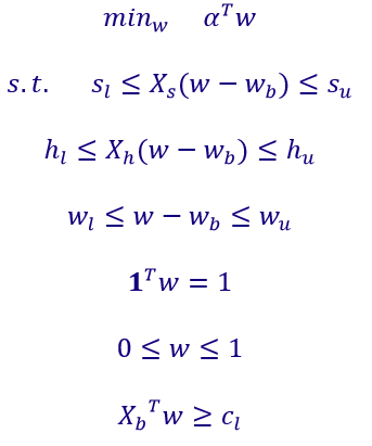 其中, 表示因子暴露,表示待优化的权重,表示Barra风格因子暴露矩阵,具体包括贝塔、动量、规模、盈利率、残差波动率、成长、账面-市值比、流动性和非线性市值等Barra风格因子,表示行业哑变量矩阵,和分别表示风格暴露的偏离上下限,和分别表示行业偏离上下限, 和分别表示权重偏离的上下限,表示股票池个股是否位于指数成分股的示性向量,表示成分股权重之和下限。约束条件和的参数设置为-0.01,和设置为0.01,设置为0.8,和分别设置为-0.01和0.01。